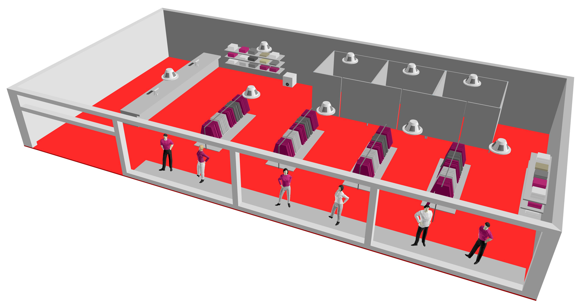 V případě hlasitého ozvučení musíme dbát na to, aby zvuk byl líbivý a výrazný. Navíc, efektní je, když toto ozvučení je nenápadné, ale dostatečně výkonné. Na základě provedení prodejny se rozhodneme, zda reproduktory budou na stěnách, nebo vestavěné v podhledovém stropě.