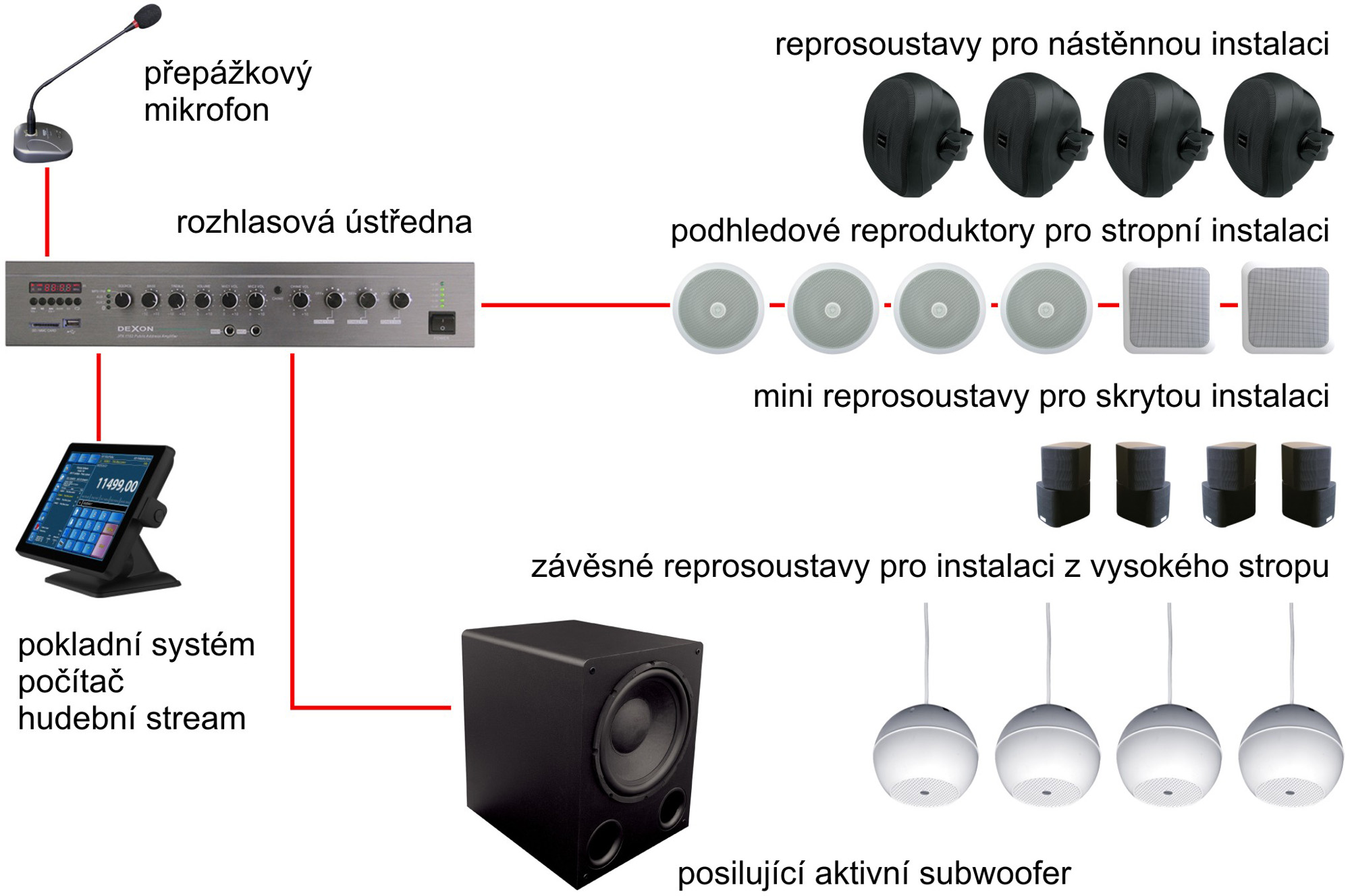 To nejpodstatnější nakonec. Čím reproduktory nabudit? Výhodou prodejnového ozvučení je fakt, že nepotřebujeme řešit zóny. Hlavním zesilujícím prvkem bude tzv. rozhlasová ústředna. Jako základní modely (lišící se výkonem) Dexon nabízí řadu JPA 1032, JPA 1182, JPA 1302, JPA 1652. Patřičný model vybereme v podstatě podle typu a množství použitých reproduktorů. Ústředna nejenom zesiluje, ale má vestavěn i Mp3 přehrávač, FM rádio, Bluetooth a množství vstupů, takže použití různých zdrojů hudby se meze nekladou. Někdy prodejny přehrávají své Mp3 soubory, někdy FM rádio, někdy mají ústřednu napojenou na počítač pokladny, který poslouchá hudební stream z centrály (to je případ prodejen v řetězcích).